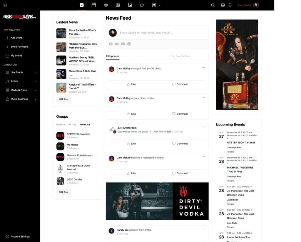From band and venue profiles to group discussions and collaboration, SEEROCKLIVE.com provides the tools to unite Canada’s music community. Whether you’re an artist, fan, booker, or industry professional, our platform ensures you have everything you need to connect, create, and thrive in one powerful ecosystem.